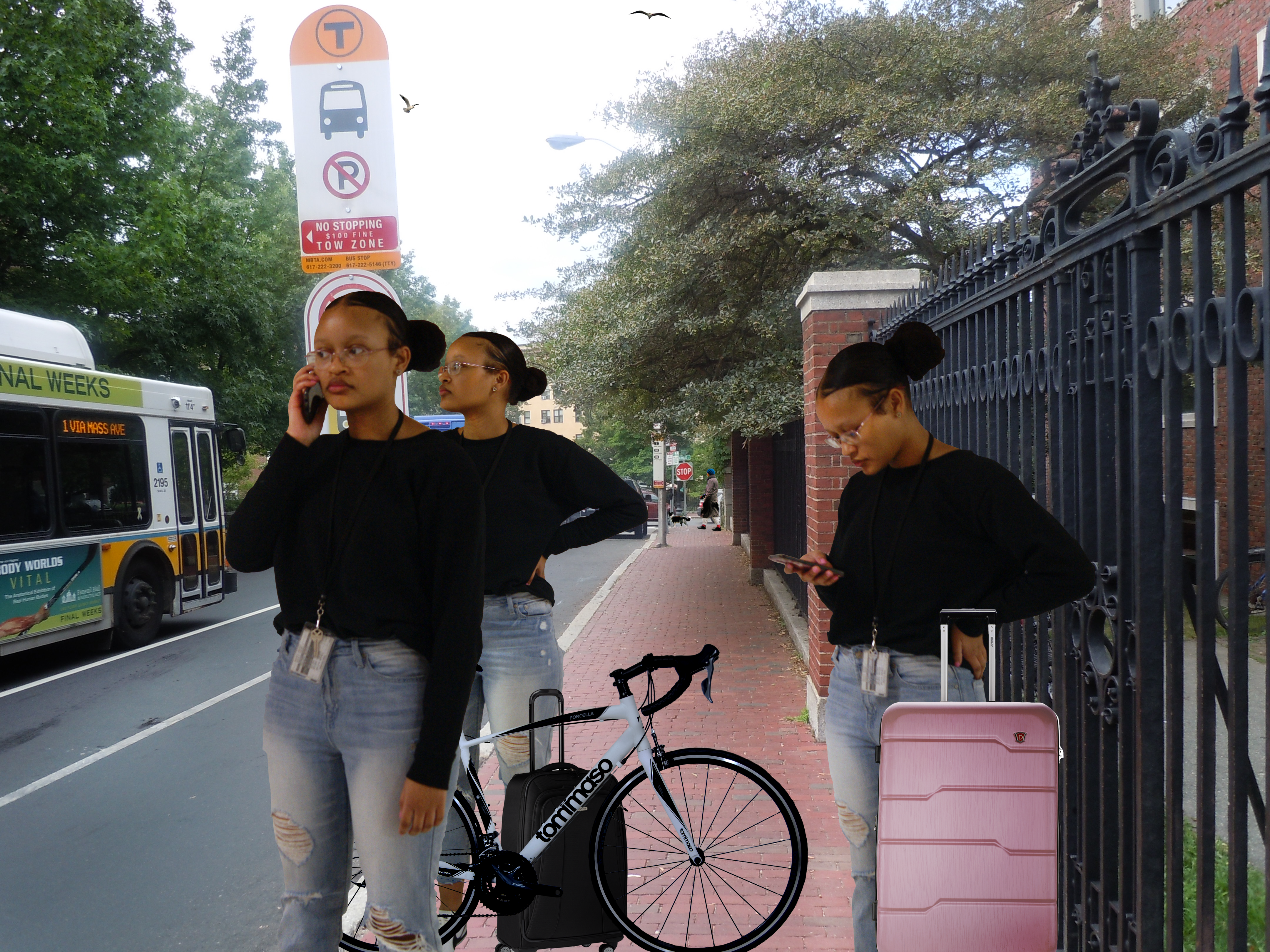 For my multiple mes project I decided to make a scene where I was waiting for the bus. The subject matter of my piece is meant to be realistic and casual. For this project I used Photoshop and Google. I began with brainstorming ideas, which was honestly one of the hardest parts for me. I settled on the idea of the bus stop and from there I began creating it. I searched Google for images to use and took photos of myself to add. I at first had a few different ideas on how to do the bus stop and I was conflicted in which to choose, but I finally settled on the version I liked. I didn’t have much of an inspiration for this project, but I knew I wanted it to capture something you might do every or every other day, hence the idea of the bus stop. (The piece is a bit exaggerated though). This project was interesting and I think it challenged my skill of decision making and recognizing what I can do and add to make my projects better. I think my final piece is kind of close to what I imagined and there isn’t too much I would change about. If I did change something though, it would be the poses I did. I’m pretty satisfied with my project.